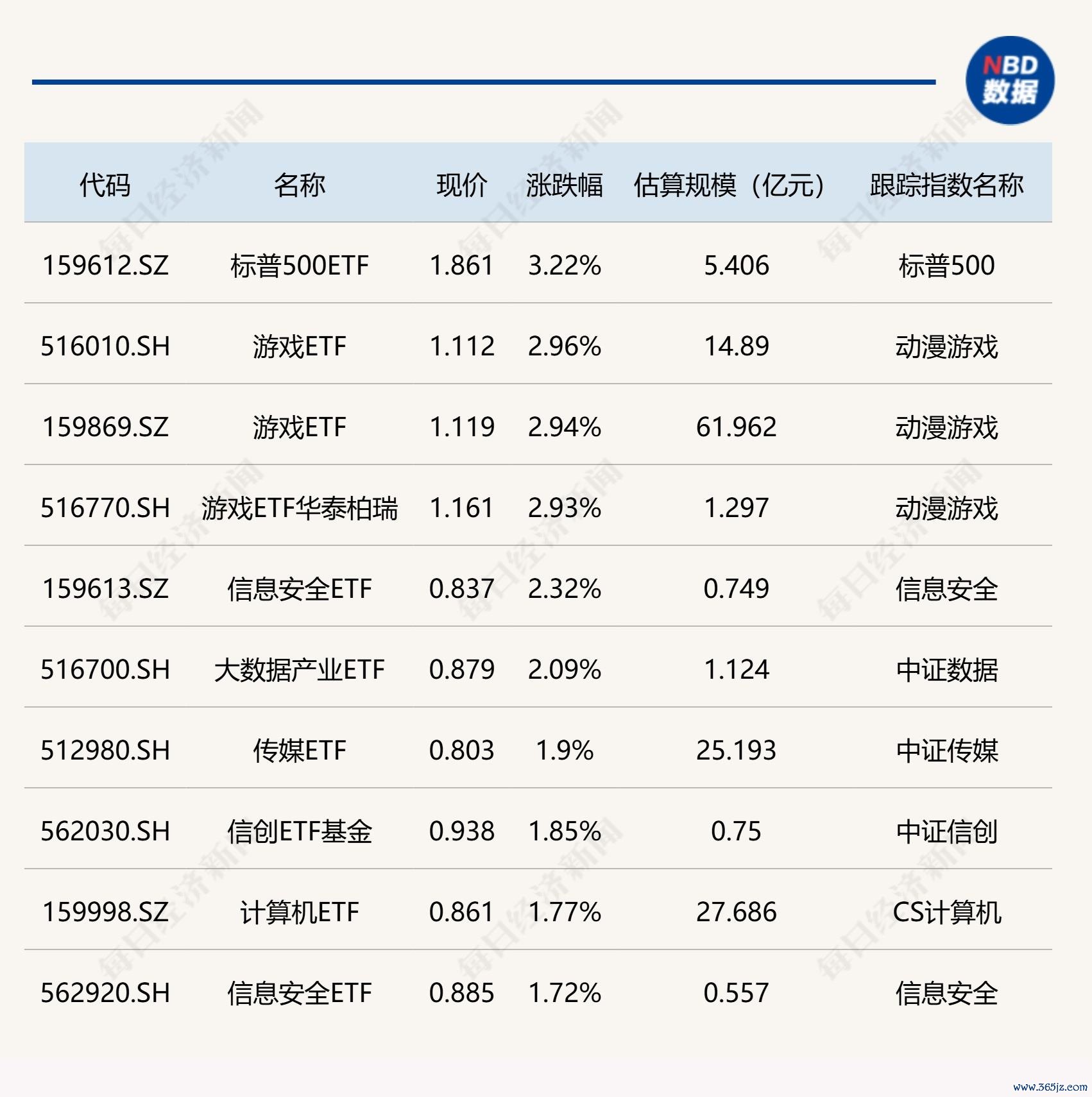 ETF涨跌幅方面,标普500ETF、游戏ETF涨约3%。